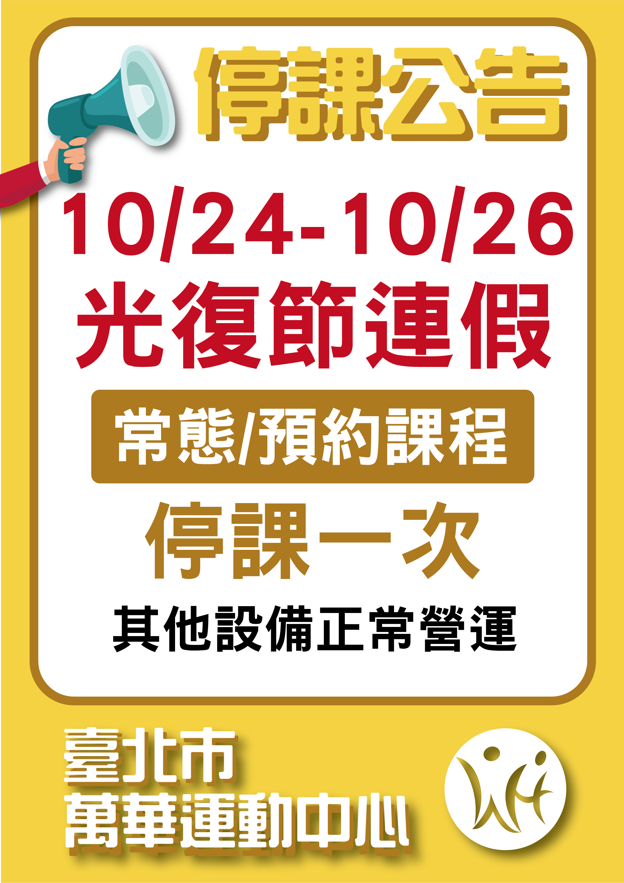 ::: 【停課公告】 光復節連假 10/24-10/26 常態/預約課程 停課一次 其他設備正常營運 九月 30, 2025公告 【停課公告】 光復節連假 10/24-10/26 常態/預約課程 停課一次 其他設備正常營運
