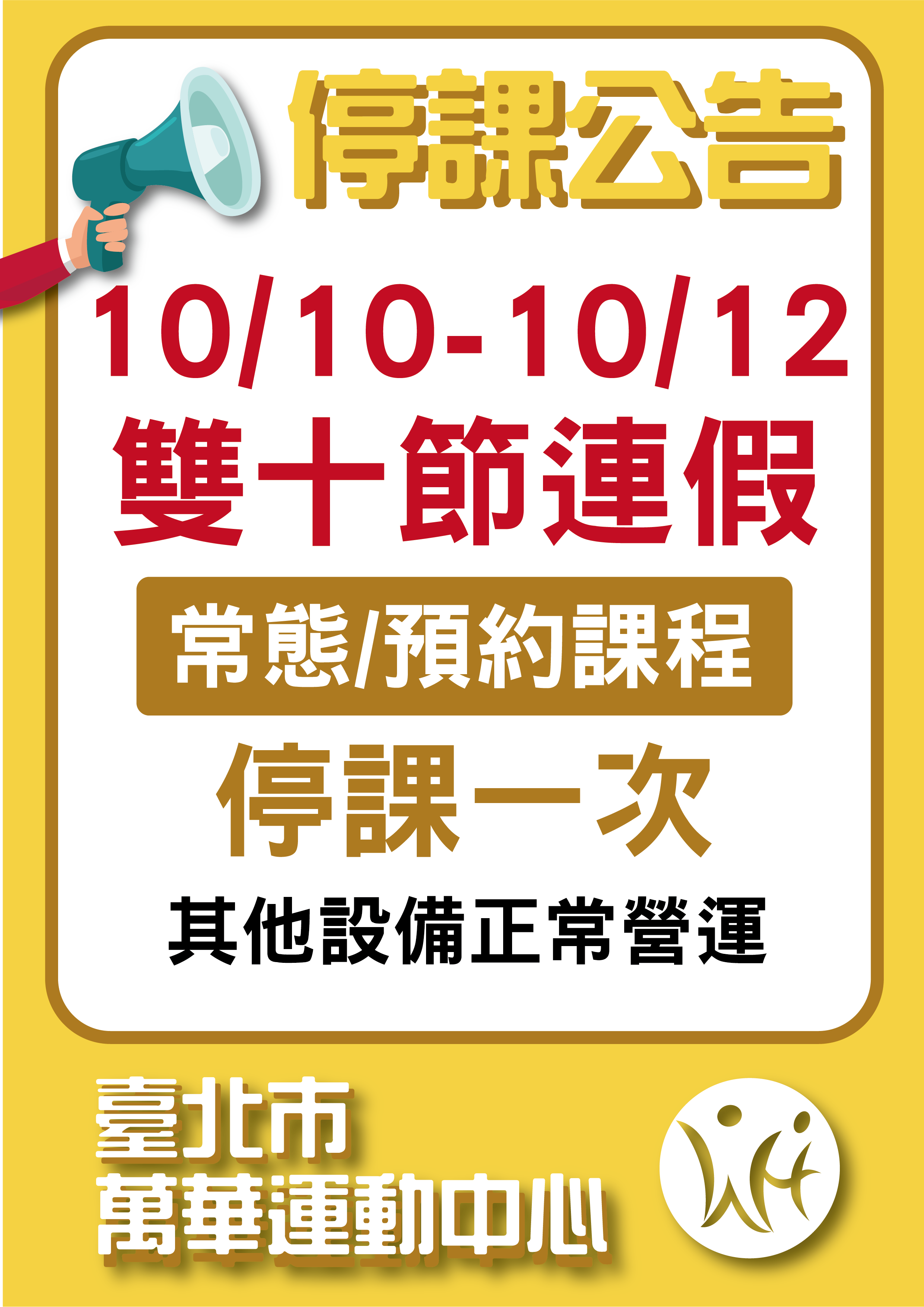 【停課公告】 雙十節連假 10/10-10/12 常態/預約課程 停課一次 其他設備正常營運