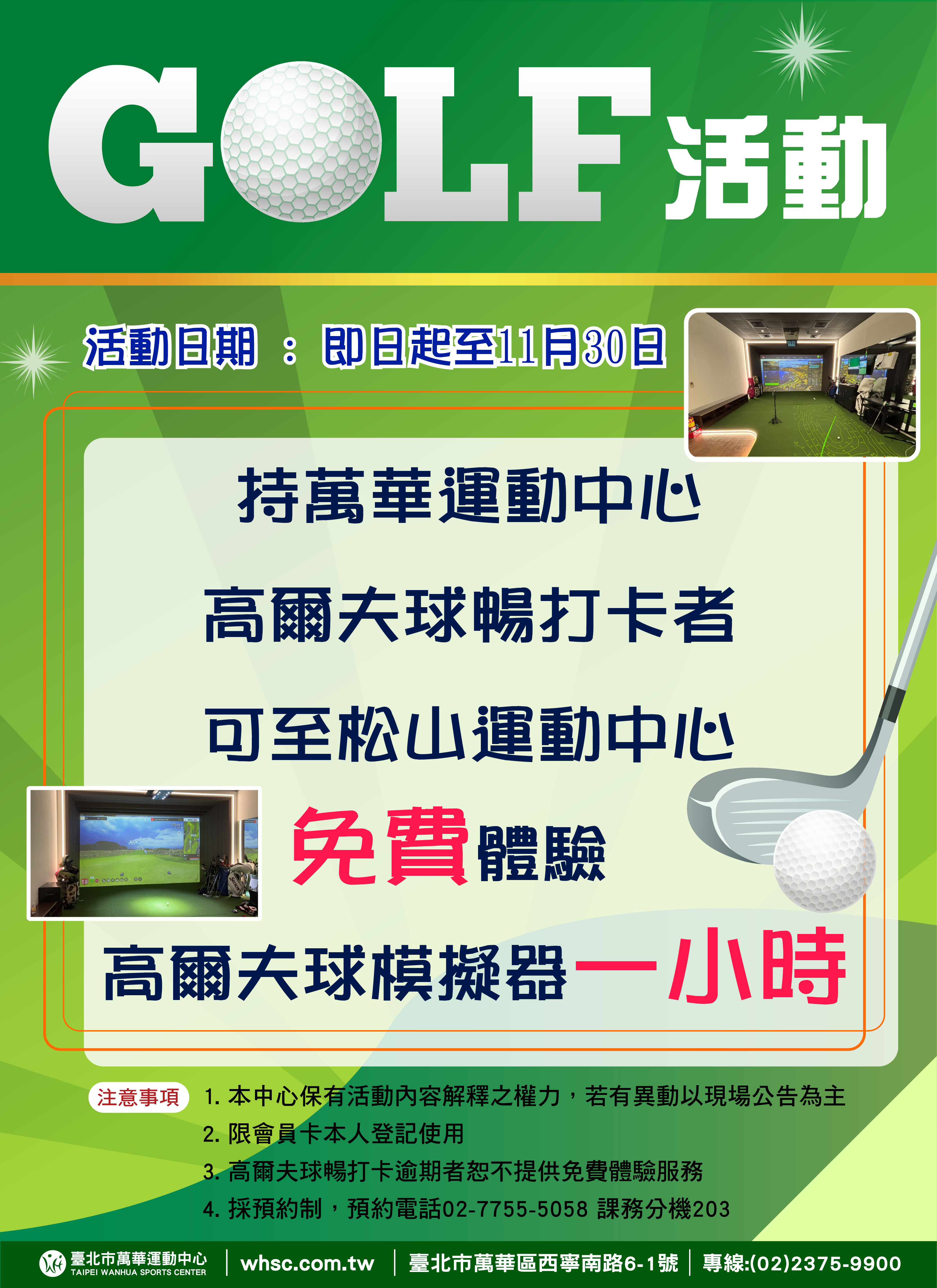::: 【活動】GOLF活動 十一月 14, 2025促銷 【活動】GOLF活動 持萬華運動中心高爾夫球暢打卡者可至松山運動中心 免費體驗高爾夫球模擬器一小時 活動日期 : 即日起至11月30日 【注意事項】 1. 本中心保有活動內容解釋之權力,若有異動以現場公告為主 2. 限會員卡本人登記使用 3. 高爾夫球暢打卡逾期者恕不提供免費體驗服務 4. 採預約制,預約電話02-7755-5058 課務分機203