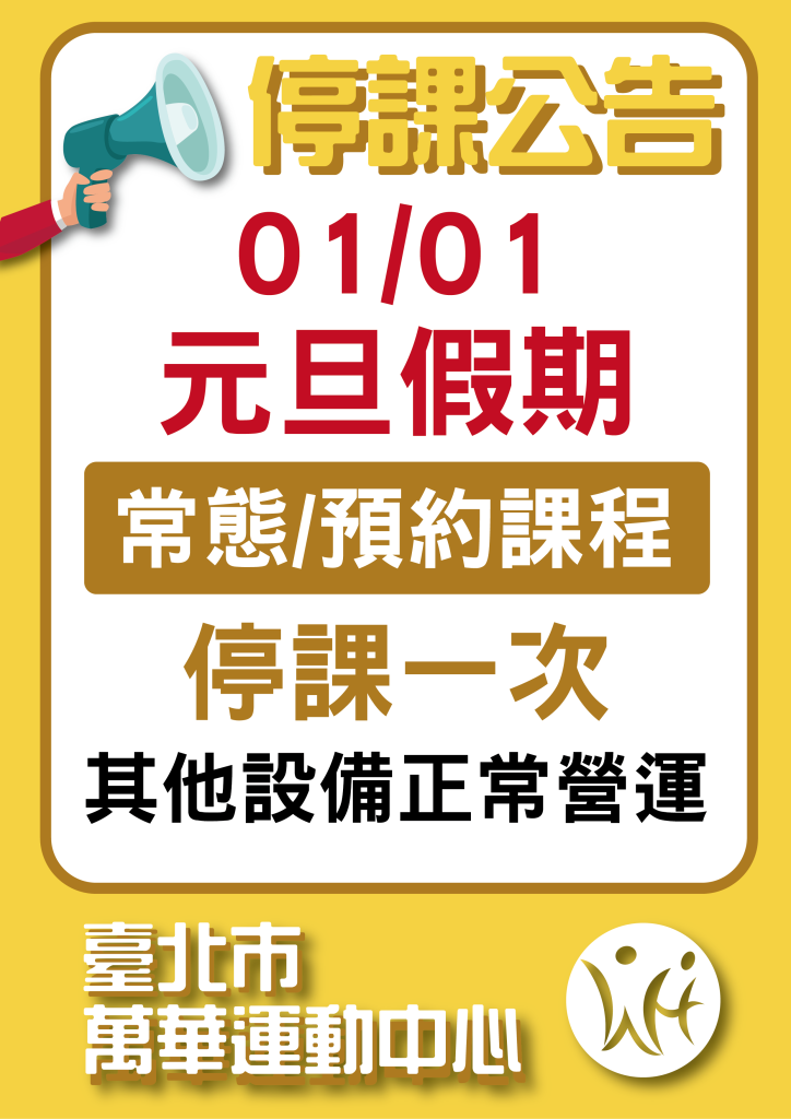 【停課公告】 元旦假期 01/01 常態/預約課程 停課一次 其他設備正常營運
