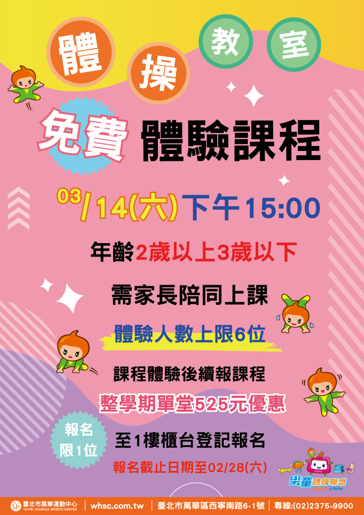 ::: 【活動】 體操教室免費體驗課程 5 2 月, 2026活動 【活動】 體操教室免費體驗課程03/14(六)下午15:00年齡2歲以上3歲以下需家長陪同上課體驗人數上限6位課程體驗後續報課程整學期單堂525元優惠報名限1位 至1樓櫃檯登記報名報名截止日期至02/28(六)