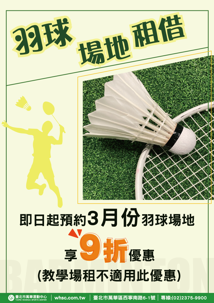 ::: 【活動】羽球場地租借 6 3 月, 2026促銷 【活動】羽球場地租借 即日起預約3月份羽球場地享9折優惠 (教學場租不適用此優惠) ※ 注意事項 本中心保有活動內容解釋之權力,如有異動,以現場公告為主 ※ 如有任何問題歡迎來電 (02)2375-9900 #台北市萬華運動中心 ※ 營業時間 : 週一至周日 早上06:00至晚上22:00 ※ 中心地址:台北市萬華區西寧南路6-1號(福星國小操場對面、洛陽停車場後方、西寧市場隔壁外面有個六人制的足球場)