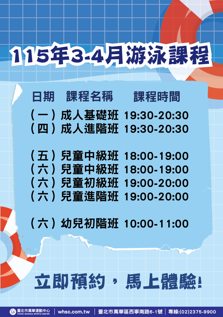 ::: 【課程】115年3-4月游泳課程 7 3 月, 2026課程 【課程】115年3-4月游泳課程 立即預約,馬上體驗! ※ 注意事項 本中心保有活動內容解釋之權力,若有異動依現場公告為主 ※ 如有任何問題歡迎來電 (02)2375-9900 報名課程及活動問題 請撥分機 601 #台北市萬華運動中心 ※ 營業時間 : 週一至周日 早上06:00至晚上22:00 ※ 中心地址:台北市萬華區西寧南路6-1號(福星國小操場對面、洛陽停車場後方、西寧市場隔壁外面有個六人制的足球場) #游泳